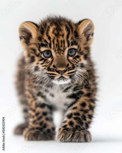 © Eyestetix Studio, Fototapeta premium the baby Amur Leopard, portrait view, white copy space on right, Isolated on white Background