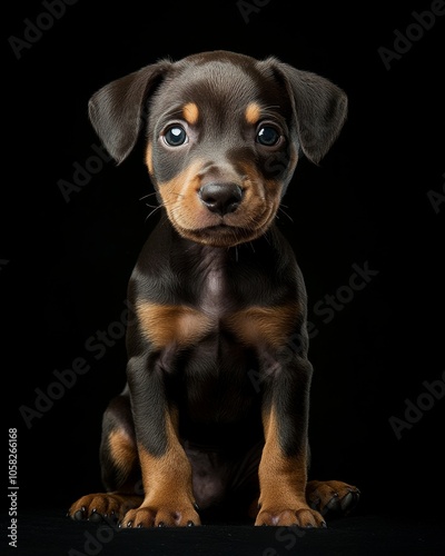 © Eyestetix Studio, Obraz premium the baby Doberman Pinscher front view, white copy space on right, Isolated on black Background