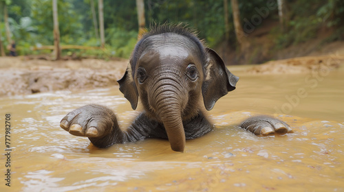 Fototapeta premium The baby elephant frolics and splashes in the water.