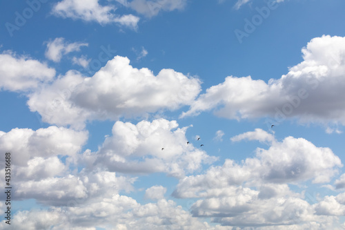 © Naletova, Naklejka premium The background is blue sky with beautiful white clouds and a flock of flying birds against its background