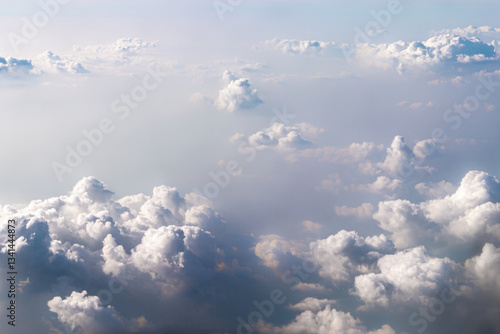 © Vladimir Razgulyaev, Obraz premium The background is textured dramatic blue-white clouds in the sky, the view from the window of a samsolet. Fantastically beautiful natural background, a peaceful and peaceful scene of real nature.