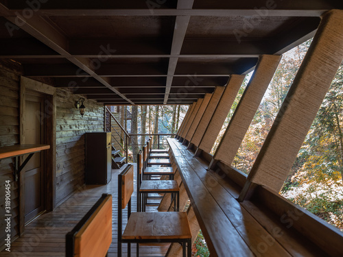Obraz premium The balcony of the forest cafe is made of wood with wooden furniture. Inside view