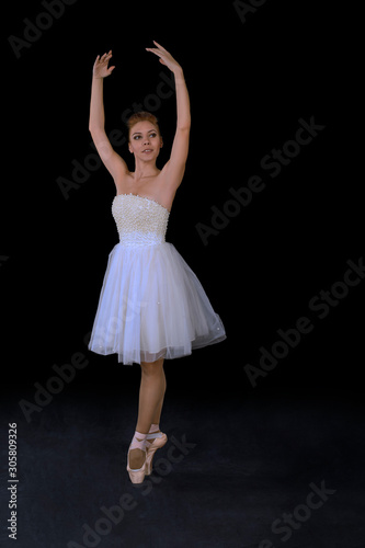 © rozaivn58, Naklejka premium the ballerina in pointes and a dress dances on a black background