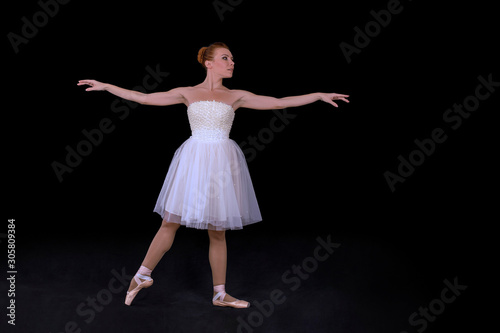 © rozaivn58, Naklejka premium the ballerina in pointes and a dress dances on a black background