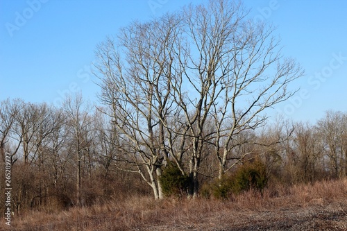 © Al, Fototapeta premium The bare trees in the grass field on a sunny day.