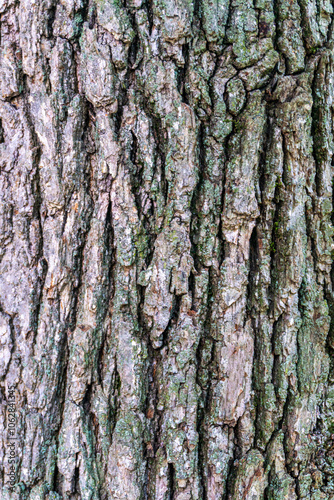 Obraz premium The bark of the pine tree is brown with deep cracks and partly with moss