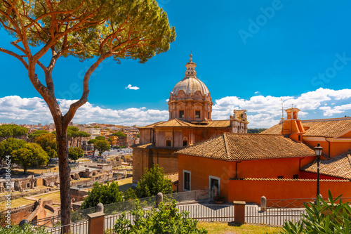Obraz premium The Baroque church of Santi Luca e Martina with the remains of the Roman Forum in the sunny day in Rome, Italy