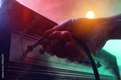 Fototapeta premium The bass guitarist connects the bass guitar to the amplifier on the stage.