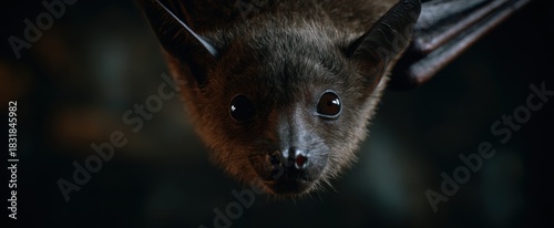 © ckybe, Naklejka premium The bat clings firmly to the ceiling hanging headfirst.