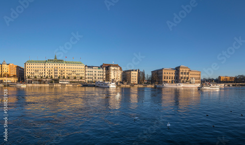 © Hans Baath, Fototapeta premium The bay Strömmen museums, moored boats and hotels on a pier a low winter solstice a sunny and snowy day in Stockholm
