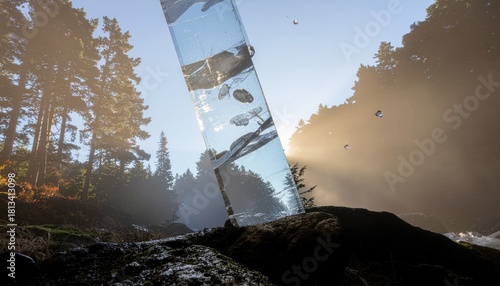 Fototapeta premium The Beam of Light Illuminates Nature's Serene Landscape with Majestic Trees and Flowing Water