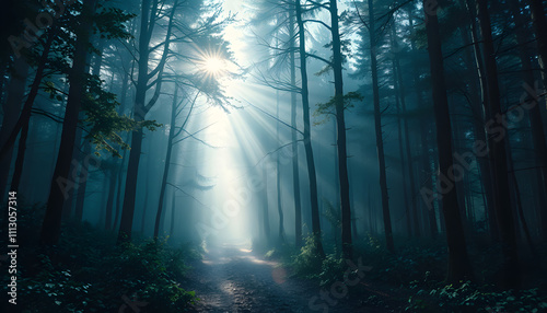 © Sergey, Naklejka premium The beam of light in the path of the magic forest isolated with white highlights, png