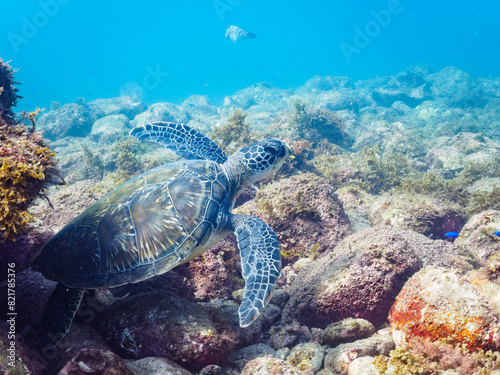 Naklejka premium ゆったり泳ぐ美しく大きなアオウミガメ(ウミガメ科)。日本国静岡県伊豆半島賀茂郡南伊豆町中木から渡し船で渡るヒリゾ浜にて。 2022年夏水中撮影。The Beautiful and large green sea turtle (Chelonia mydas, family Turtles).Hirizohama beach, by ferry from Nakagi, Minami-