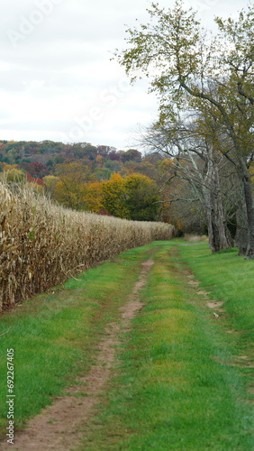 © Bo, Fototapeta premium The beautiful autumn view with the colorful trees and harvest corn field