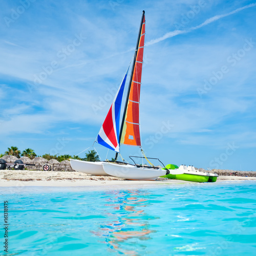 Naklejka premium The beautiful beach of Varadero in Cuba with a colorful sailboat