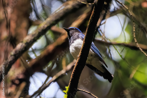 © d3_plus, Naklejka premium 新緑の中、大きく美しい声でさえずる美しいオオルリ(ヒタキ科)。日本国東京都あきる野市、日の出山登山道他。 2024年6月撮影。The beautiful Blue-and-white Flycatcher (Cyanoptila cyanomelana) chirp loudly and beautifully in the fresh green.