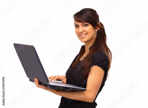 © yurolaitsalbert, Naklejka premium The beautiful business woman with the computer on