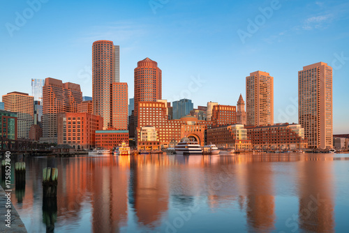 © Jose Luis Stephens, Naklejka premium The beautiful cityscape of Boston at dawn, showing the waterfront and buildings reflected in the calm water.