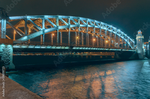 Naklejka premium the beautiful metal bridge of Peter the Great across the Neva River in St. Petersburg against the night sky