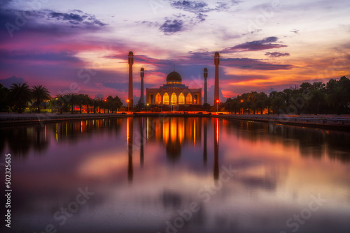 Naklejka premium The beautiful mosque with a beautiful sky on the evening on Songkhlaburi