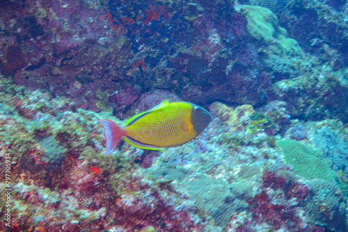 Fototapeta premium 美しいナメモンガラ(モンガラカワハギ科)他。スキンダイビングポイントの底土海水浴場。 航路の終点、太平洋の大きな孤島、八丈島。 東京都伊豆諸島。...