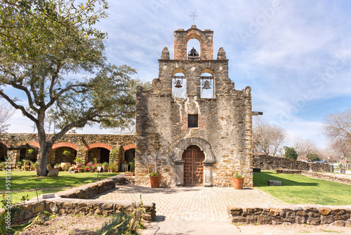 © Gerald Zaffuts, Naklejka premium The beautiful stone Mission Espada bathed in sunlight, San Antonio, Texas, a UNESCO World Heritage Site