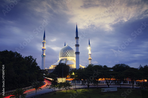 Naklejka premium The beautiful Sultan Salahuddin Abdul Aziz Shah Mosque over stunning sunrise background. soft focus due to long exposure shot.