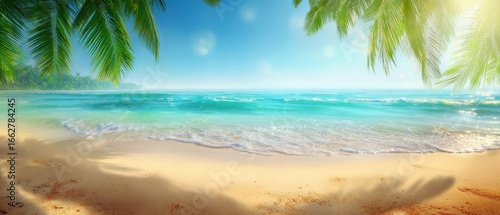Fototapeta premium The beautiful tropical beach with clear water and palm trees gently swaying.