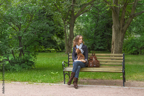 Fototapeta premium The beautiful woman with a little dog sitting on a bench in the park and...