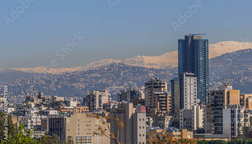 © Artaxerxes, Obraz premium The Beirut panorama view in Lebanon, with the modern skyscrapers, Lebanese architecture and snow covered mountains.