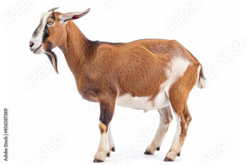 © Eyestetix Studio, Fototapeta premium the beside view Anglo-Nubian Goat standing, left side view, white copy space on right isolated on white background