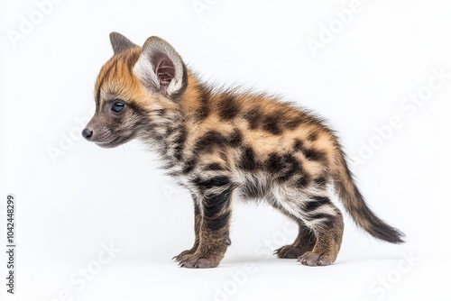 © Eyestetix Studio, Obraz premium the beside view baby Aardwolf standing, left side view, low angle, white copy space on right, Isolated on White Background