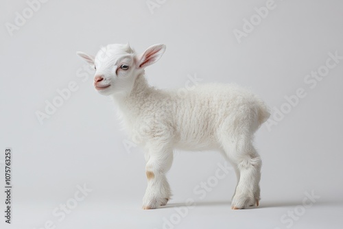 Fototapeta premium the beside view baby Domestic Goat standing, left side view, low angle, white...