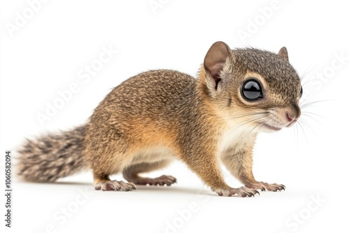 © Eyestetix Studio, Obraz premium the beside view baby Flying squirrel standing, left side view, low angle, white copy space on right, Isolated on White Background
