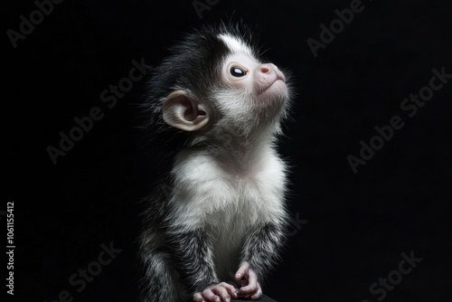 © Eyestetix Studio, Naklejka premium the beside view baby Tamarin primate standing, left side view, low angle, white copy space on right, Isolated on black Background