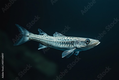 © Eyestetix Studio, Fototapeta premium the beside view Guachanche Barracuda, left side view, white copy space on right, Isolated on dark Background