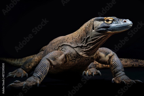 © Eyestetix Studio, Obraz premium the beside view Komodo Dragon, left side view, white copy space on right, isolated on black background