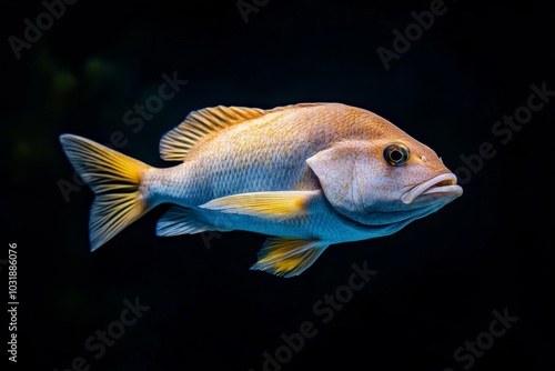 © Eyestetix Studio, Fototapeta premium the beside view Mutton Snapper, left side view, white copy space on right, Isolated on dark Background