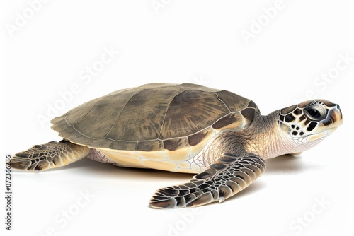 © Eyestetix Studio, Obraz premium the beside view Olive Ridley Sea Turtle, left side view, white copy space on right, dutch angle view, isolated on white background