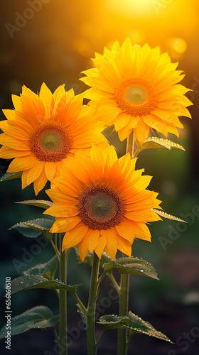 Fototapeta premium The best photo of 3 sunflowers that are beautiful and realistic. Natural blur background,8k
