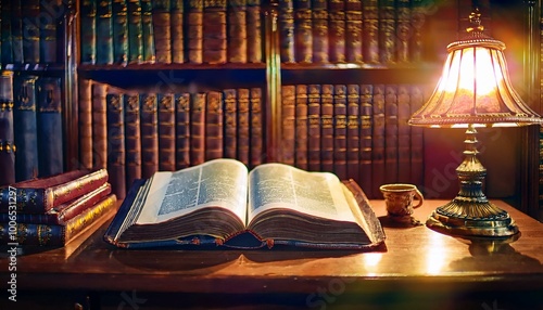 © Daniel, Fototapeta premium The Bible in Old Library Nook. An open Bible rests on a mahogany desk.
