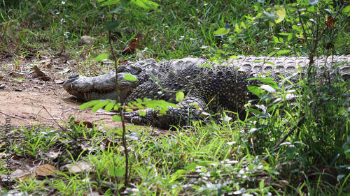 © Udayakumar, Obraz premium The big crocodile is lying on the ground. In the dim background