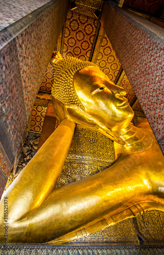 © Sony Herdiana, Fototapeta premium The Big Reclining Buddha statue in Wat Pho Temple, an Asian style Buddha Art, open to worship. Wat Pho is an important temple in Bangkok, Thailand.