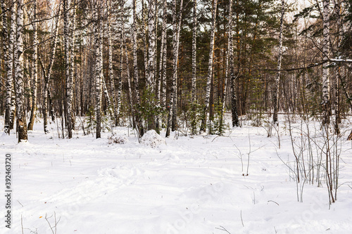 © Svetlana Khor, Fototapeta premium The birch and spruce forest is covered with snow