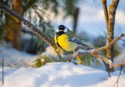 Naklejka premium The bird tit sits on a snow-covered branch of a red mountain ash on a sunny frosty day