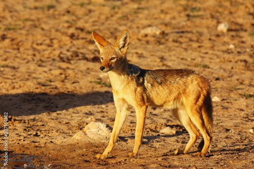© Karlos Lomsky, Fototapeta premium The black-backed jackal (Canis mesomelas) drinks at the waterhole in the desert. Jackal by the water in the evening light. Jackal at sunset at waterhole.