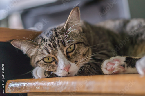 © jamesjoong, Naklejka premium The black cat is lying down and looking this way.