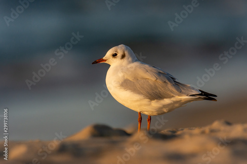 Obraz premium The black-headed Gull (Chroicocephalus ridibundus) sitting on a beach during sunset