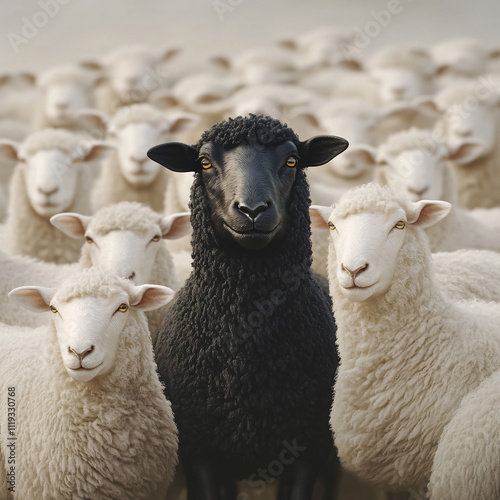 Fototapeta premium The Black Sheep In The Herd Of White Sheep, Concept for being special and...