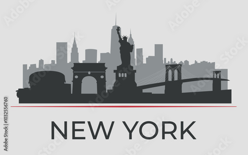 © Dima, Obraz premium The black silhouette of the New York City skyline is emphasized by a red line. Vector on a gray background